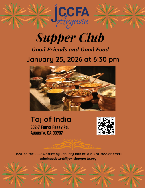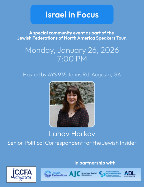 The JCCFA promotes a vibrant, active Jewish Community in the CSRA area. We are the local partner for the PJ Library program. We sponsor events and activities that foster Jewish life, Jewish values, and Judaism worldwide, and/or educate the Jewish and non Jewish community on current events from a Jewish perspective.
