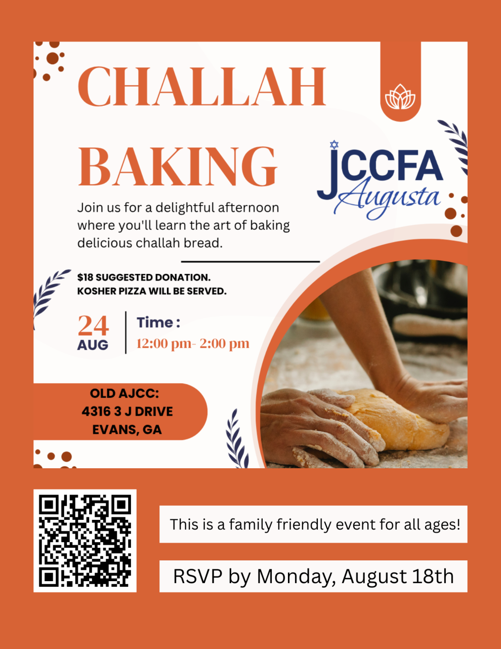 Join us for a delightful afternoon of learning to bake Challah bread. We will provide the dough and have a pizza lunch.