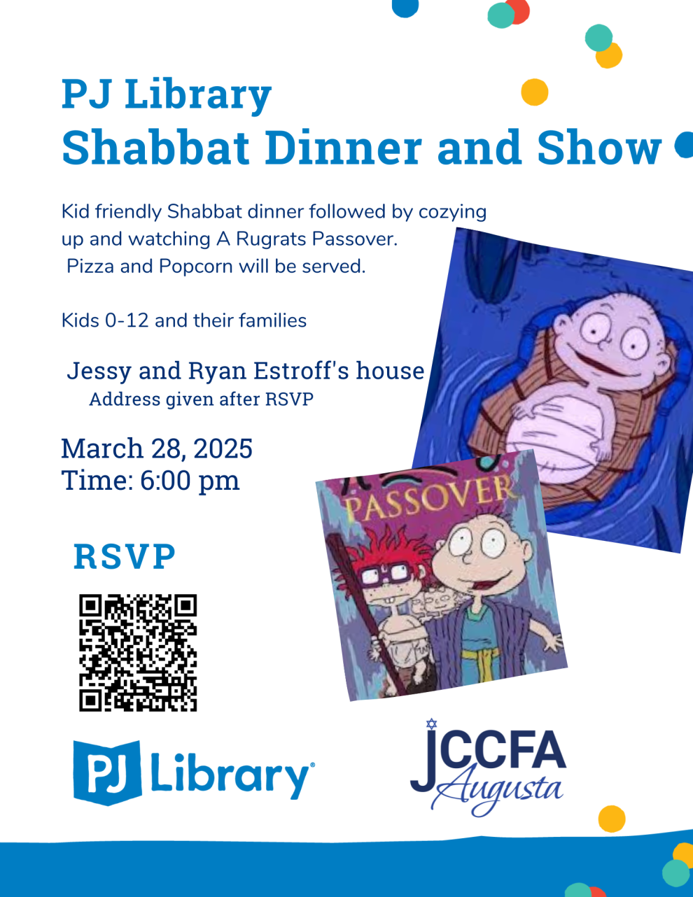 We will have a kid friendly Shabbat dinner of Pizza followed by cozying up and watching A Rugrats' Passover!